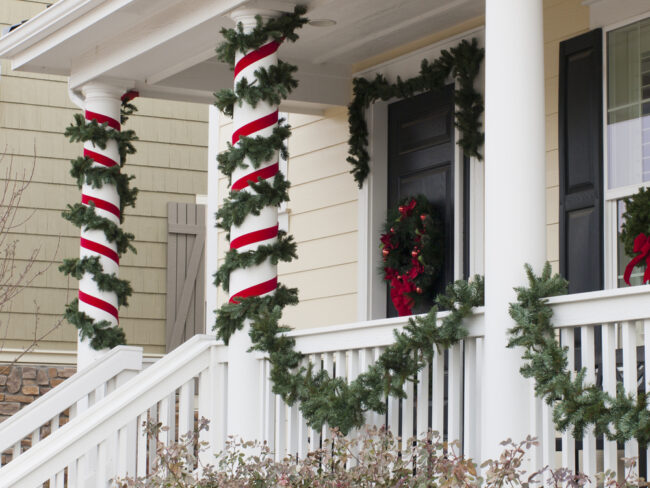 Pillars like these deserve to be wrapped in red and green. Garlands are a simple piece of winter decor anyone can find a use for! Adding in the red ribbon and festive wreaths dress this porch up for the holiday season.