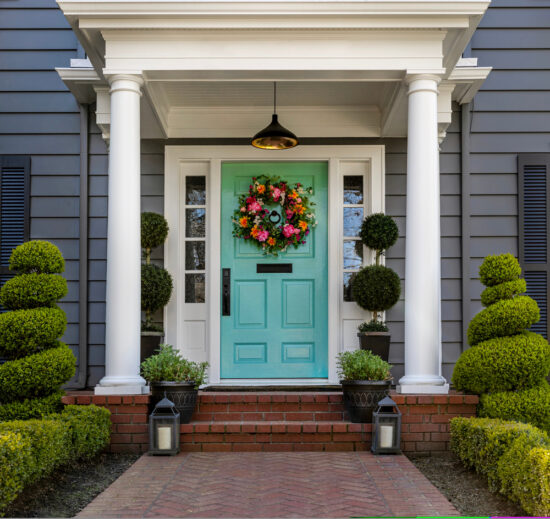 Hello yellow! The neutral green and white wreath make this yellow door POP! If your door is neutral, pick a wreath with bold colors to provide a stunning focal point. When the seasons change, simply swap out the wreath and replace the matching greenery.