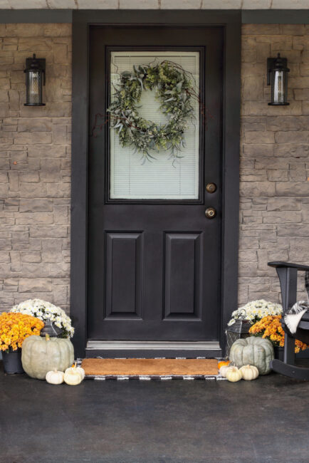 Meet your new best friends this autumn: buffalo plaid, mums, and pumpkins! Throw in some subtle lanterns to tie in the sconces and a neutral wreath that coordinates with the gray pumpkins, and your porch is dressed and ready for sweater weather!