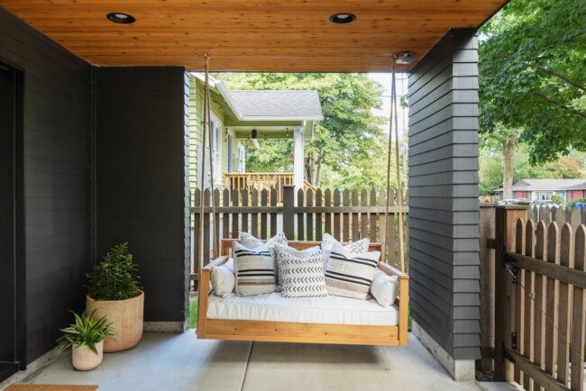 Nothing says comfort like a porch swing, and this one is to die for. The warm wood tones of the ceiling and swing compliment the black paint and greenery beautifully. This homeowner also gets bonus points for the recessed lighting – a great choice! They blend in nicely without detracting from that gorgeous wood ceiling.