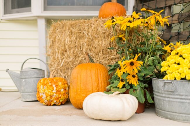 The decor on this porch will have you heading to the pumpkin patch to get lost in a hay maze. This porch proves decorating doesn’t have to be complex. Use what you have! A watering can, a few pumpkins, and a hay bale are all great decor ideas for your fall-inspired porch.