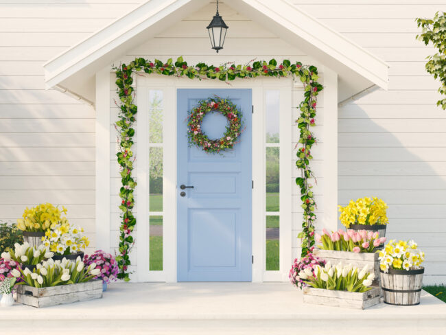 A vibrant door and warm-toned wreath combo are the perfect spring-summer tie-in. With this pretty pendant light hanging above the door, this porch won’t go unnoticed no matter when you’re decorating!