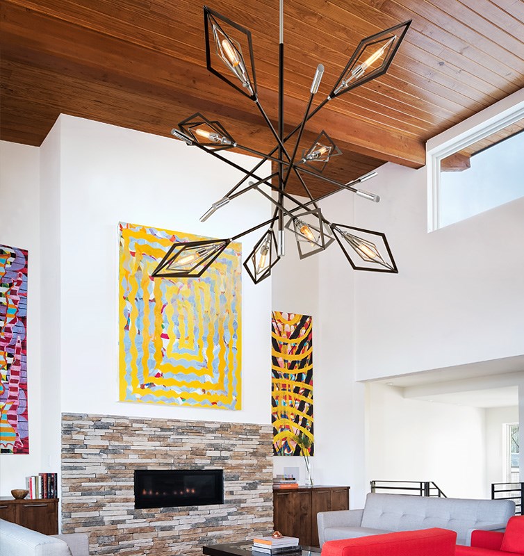 If antlers are really not your thing and you prefer your living room to feel modern and minimalist, look into contemporary light fixtures. The best way to get that contemporary vibe is with fixtures that are sleek and glossy, and composed of simple, clean lines. Geometric chandeliers and angular lamps mesh with a modern, contemporary style perfectly. Stick with neutral colors like black and white, then add some shine with metallic accents.